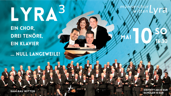 Wir sind der Männerchor Witten-Bommern "Lyra" 1909 e.V. aus Witten an der Ruhr. Die Zahl unserer Aktiven liegt derzeit bei ca. 90 Sängern, die aus Witten, Wetter, Hattingen, Sprockhövel, Schwelm, Ennepetal, Gevelsberg, Fröndenberg, Dinslaken, Hagen, Bochum und Dortmund kommen.